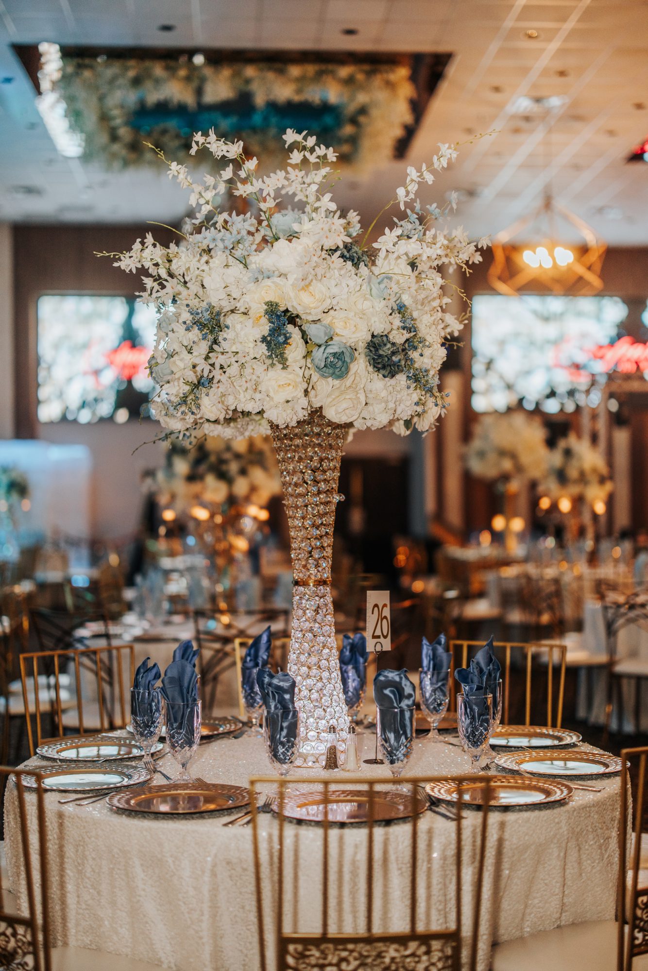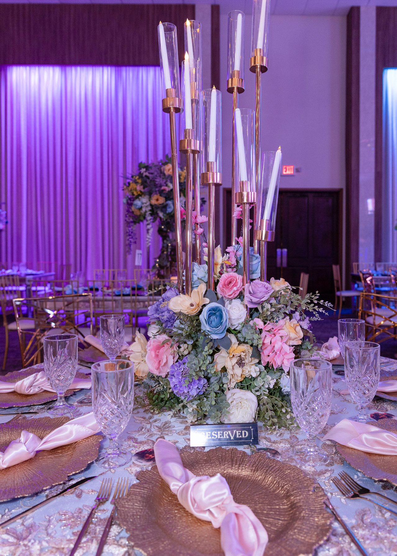 - Stunning crystal chandeliers with floral accents