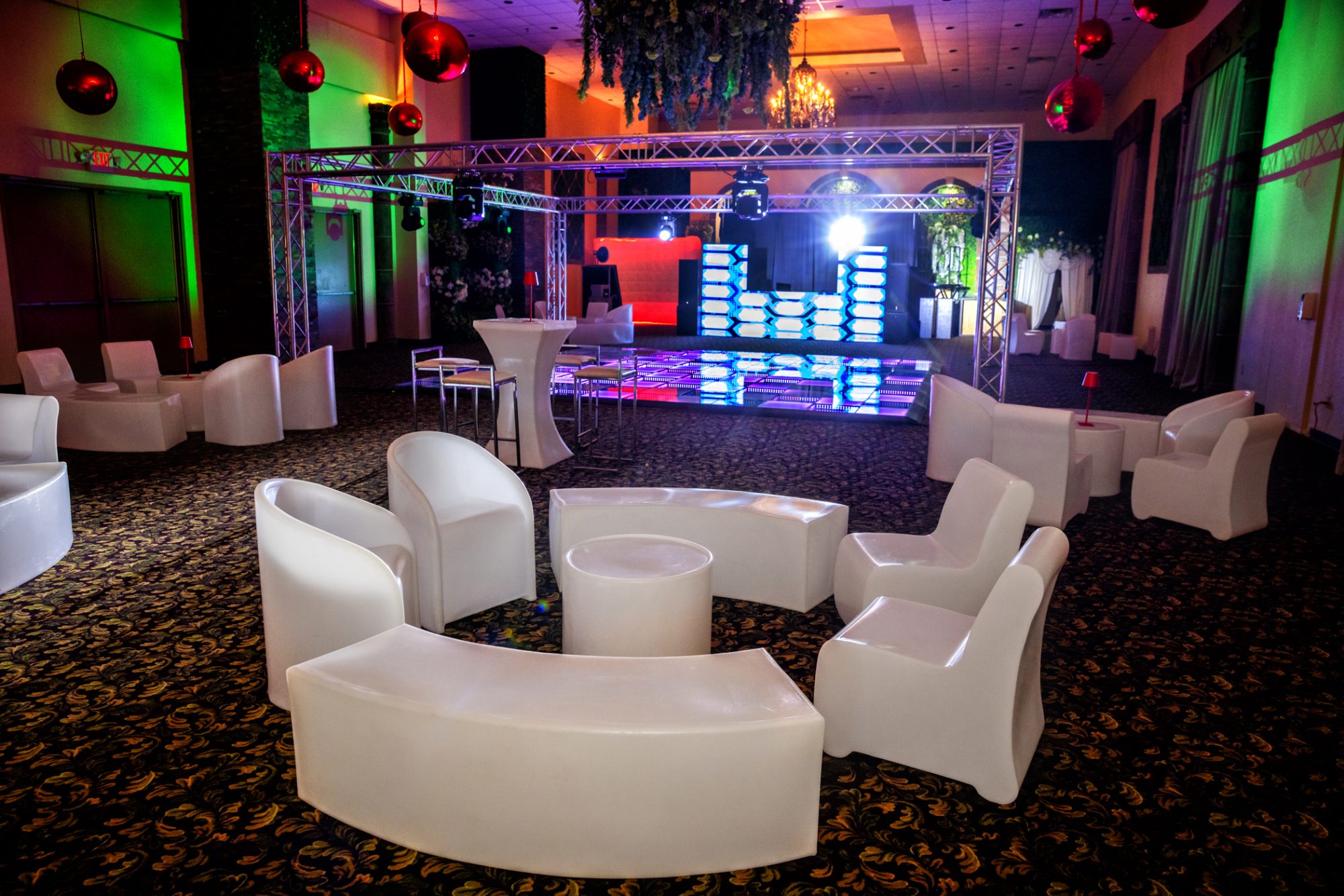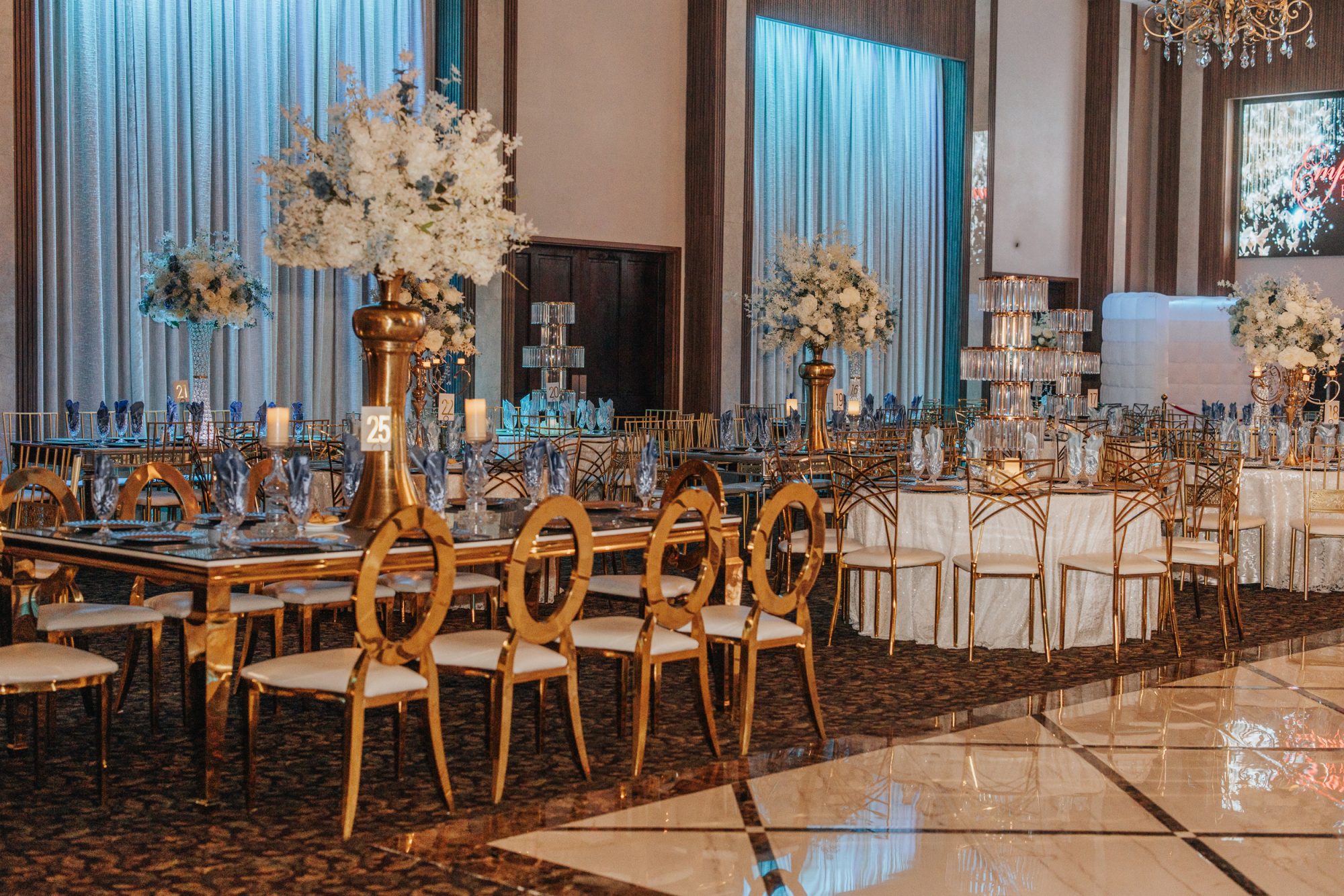 Magnificent crystal chandeliers adorned with cascading decorative flowers illuminate the space, casting a romantic glow over your celebration. The centerpiece of the room is a stunning marble dance floor, surrounded by a spacious seating area that flows seamlessly throughout the ballroom.