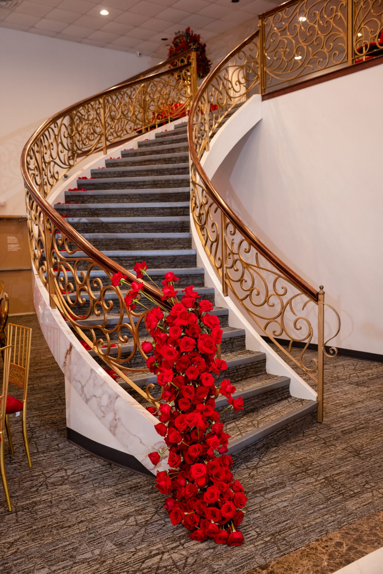 Step into a world of breathtaking elegance. The Renaissance Room captivates from the moment you enter, featuring a spectacular wrought iron double staircase that ascends to a dramatic balcony area—the perfect stage for an unforgettable entrance that will leave your guests in awe.